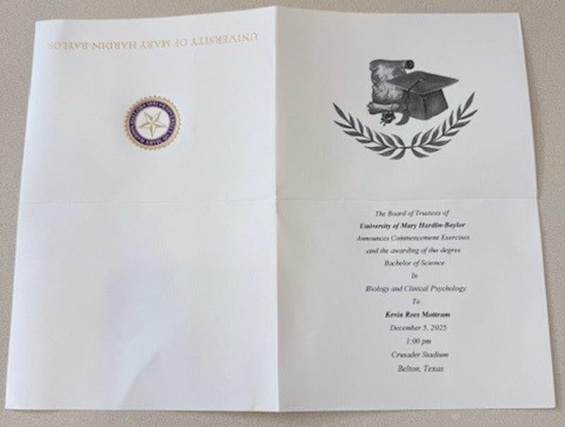 Purchase any quantity of announcements you would like. They will be printed in the UMHB Campus Store using the information that will be requested via an email that will be sent later to you. When purchased, you will get one (1) email letting you know your order confirmation number. # WO-00....... the second (2) email comes when your order is processed and your card is charged. This email states that your order is ready for pickup. It is not, please disregard that. Then you will be getting a third (3) email from us asking for the following information to be printed on the announcements: A) Name as it needs to be printed B) Degree being granted...Bachelor, Master, or Doctor. C) Major of the degree. For example: A Bachelor of Science, in Nursing. Please see the image up above for reference as to what information we need. We will only be able to print one Degree and one major on the announcement(s). We know the date, time, and place of graduation so no worries there. We know how many you ordered so please wait 48 hours before coming into the store (for in store pickup) or before getting any shipping information. No emails will be sent out for in store pickup, just allow us 48 hours to get them done before coming in. Folding instructions are also included in the package as well.